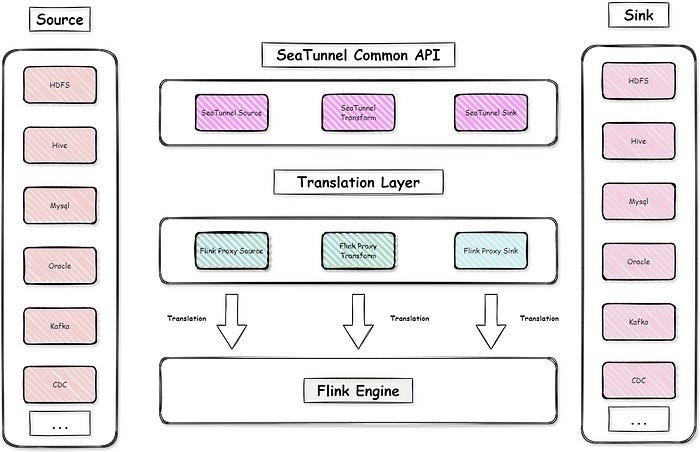 The interfacing layer in SeaTunnel is called the Translation Layer. For Flink, SeaTunnel implements Flink-proxy Source, Sink, and Transform, generating Flink engine job graphs to achieve efficient data transformation and synchronization on Flink.