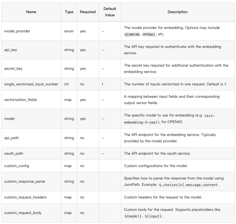 The custom_response_parse option allows you to specify how to parse the model's response. You can use JsonPath to extract the specific data you need from the response. For example, by using $.data[*].embedding, you can extract the embedding field values from the following JSON and obtain a List of nested List results. For more details on using JsonPath, please refer to the JsonPath Getting Started guide.
